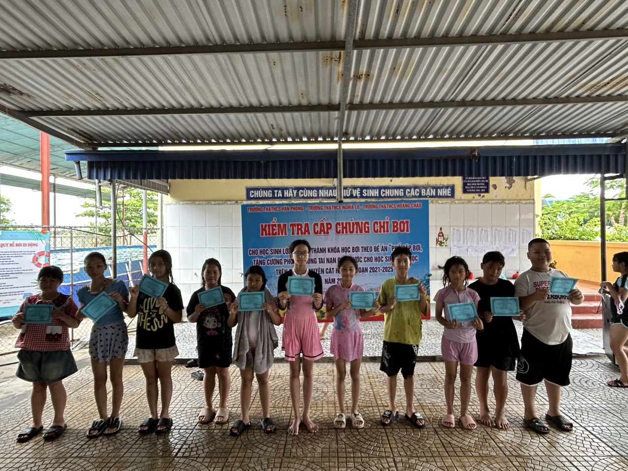 Từ ngày 21/6/2025 đến ngày 23/6/2025 ba nhà trường tổ chức buổi kiểm tra bơi cho học sinh lớp 5 nhằm đánh giá kết quả học bơi, kỹ năng phòng tránh tai nạn dưới nước cho các em học sinh sau quá trình học tập và rèn luyện tại bể bơi của trường TH&THCS Văn Phong.