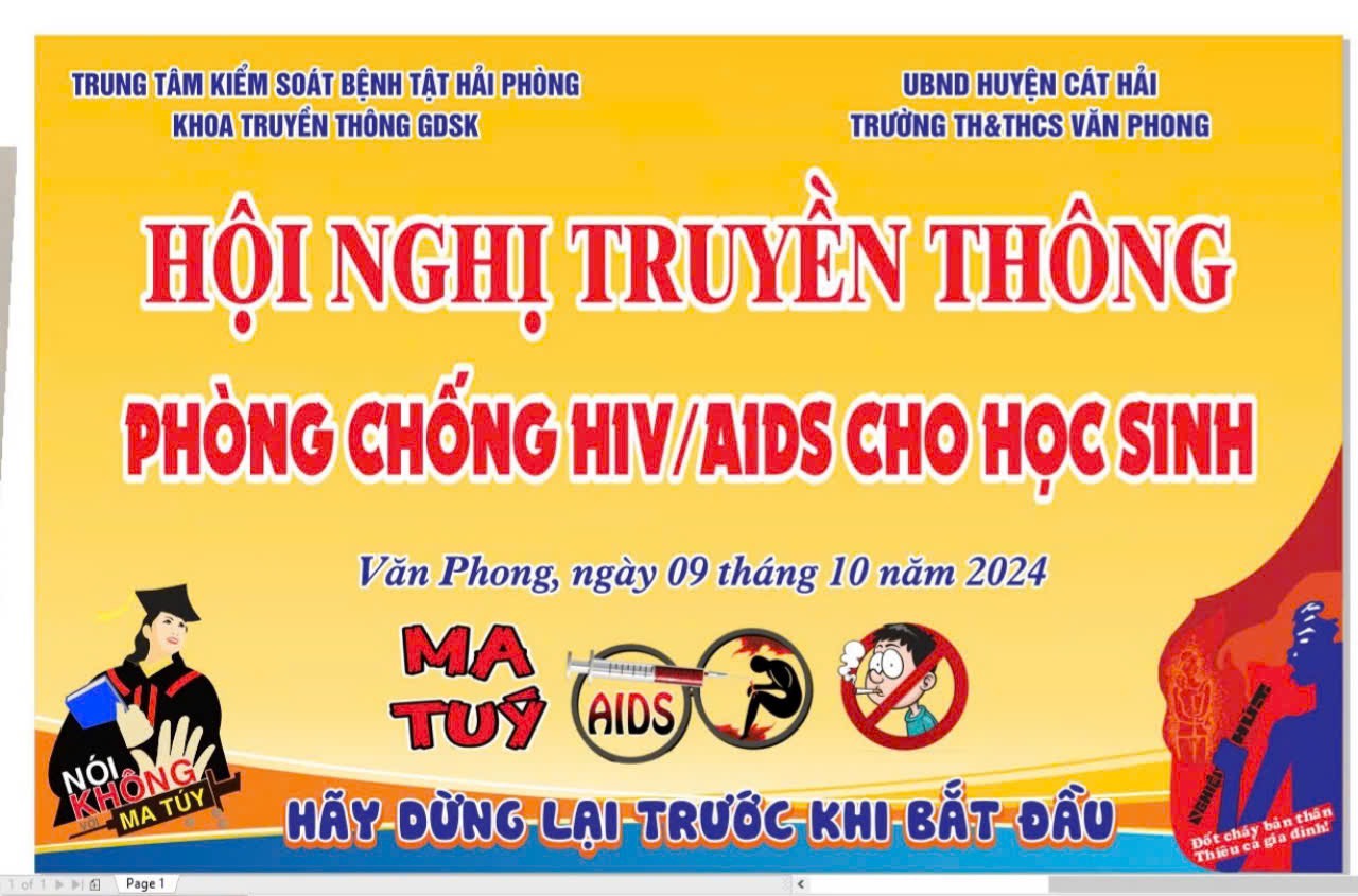 Hôm nay ngày 09/10/2024, trường TH&THCS Văn Phong phối kết hợp cùng Trung tâm Kiềm soát bệnh tật thành phố tổ chức Hội nghị truyền thông về phòng chống HIV/AIDS cho học sinh toàn trường. Hội nghị đã thu hút được 298 học sinh cùng 22 thầy cô giáo tham gia.