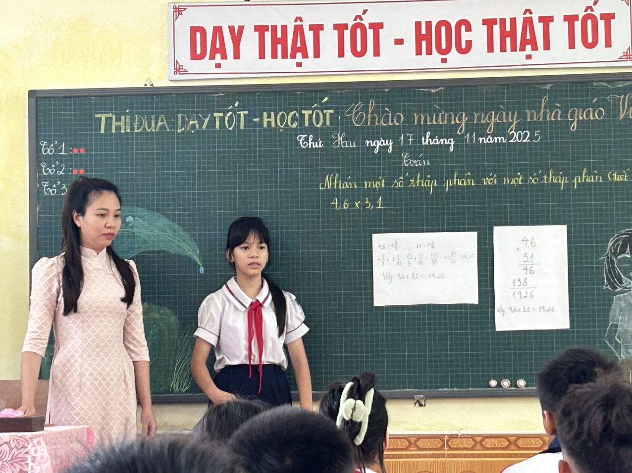 Ngay từ đầu buổi sinh hoạt, các đồng chí giáo viên đã thống nhất lựa chọn bài dạy minh họa ở môn Toán lớp 5. Bài: Nhân một số thập phân với một số thập phân (Tiết 1). Do cô giáo Bùi Thị Lê An và các em học sinh lớp 5A1 thể nghiệm. Bài dạy minh họa được xây dựng theo hình thức tổ chức học tập theo trạm lồng ghép trong một sân chơi toán học mang tên “Cuộc đua kỳ thú”, gồm 4 chặng tương ứng với từng nhiệm vụ học tập cụ thể.